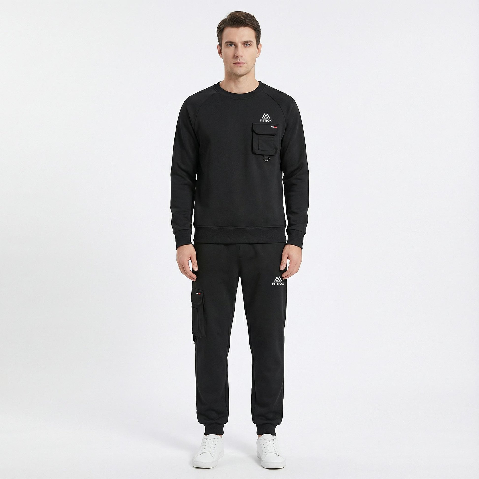 FITROX Men’s Tech Fleece Tracksuit Set – Men’s Polyester Tracksuit Set – Crew Neck Sweatshirt & Joggers – Zip Pocket Detail – S–XL