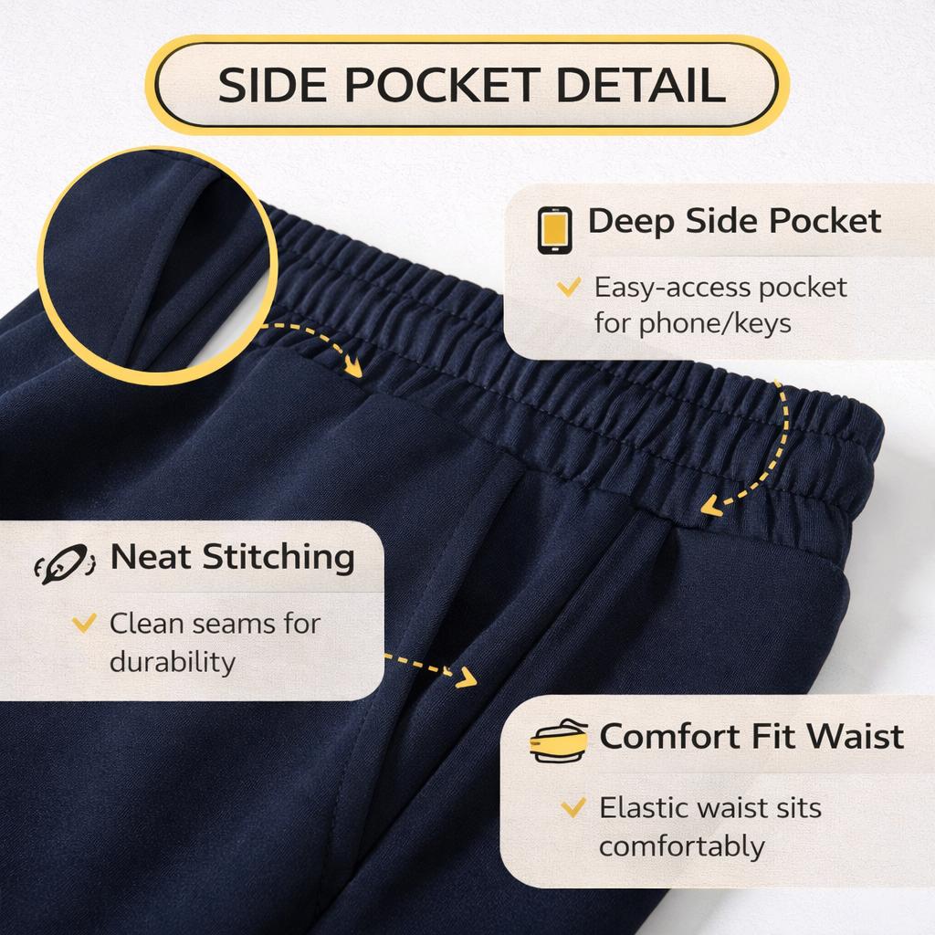 Side Pocket Detail: Deep side pocket for easy storage of essentials like phone and keys. Clean stitching for a neat finish and durable everyday wear. Elastic waist sits comfortably.