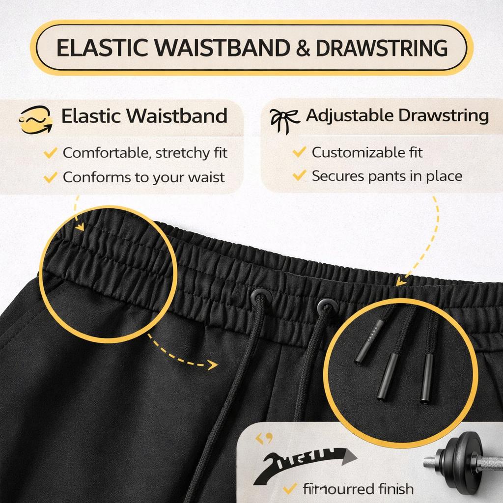 Comfort Fit Waist: The elastic waistband sits comfortably and moves with you. The adjustable drawstring lets you control the fit, helping the trousers stay in place during walking, training, or lounging.