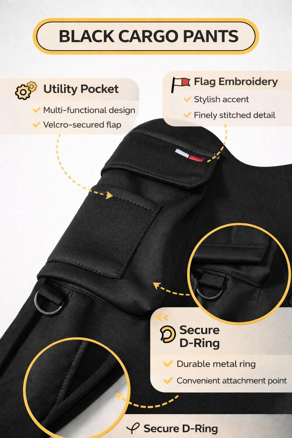 Cargo Pocket Detail: Side utility pocket with flap for secure storage. Includes a strong D-ring for attaching keys or accessories. Clean stitching and durable fabric for everyday use.
